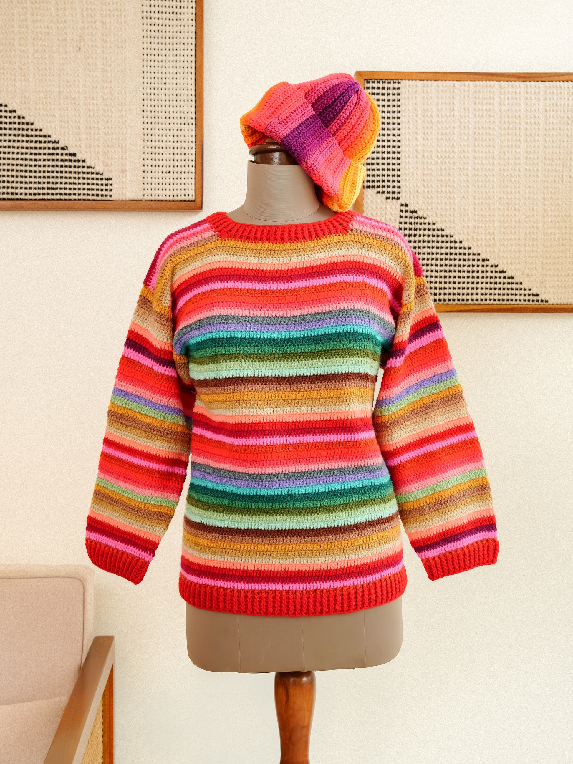 A vibrant, colorful woollen beanie cap, likely made by crocheting various bright yarns into a striped, rainbow-like pattern. It is designed to be warm, featuring a folded dark brim (or cuff) and is topped with a large, fluffy dark pom-pom. The overall look is cheerful, cozy, and perfect for cold weather.