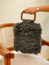 The bags are secured with a fun, whimsical closure detail: a large, fluffy, contrasting colored pom-pom (like bright blue or hot pink), which fastens the fold-over flap. The dense texture and bold color scheme make these clutches a standout accessory for adding a handcrafted, cheerful touch to any outfit.